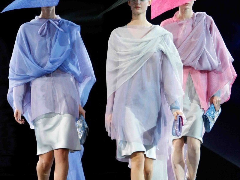 Za razliku od Ferrea, Armani je predstavio nešto ležerniju kolekciju prepunu lepršavosti i cvjetnoga uzorka s dodatkom upadljivih velikih šešira. Armani je na pisti predstavio odličan look za poslovnu ženu koji je uključivao sive kostime s hlačama i sakoima na dvostruko kopčanje. No zaigranost je dodana haljinama u boji fuksije ili pak u ljubičastim nijansama, zatim torbama i sandalama sličnih upadljivih boja, a sive, visoko rezane jaknice kombinirane su s asketskim uskim suknjama. Dizajner, čiji opušteni stilovi kreacija oduševljavaju već tri desetljeća, ovoga puta koristio je različite lagane tkanine kako bi dobio učinak sjenkastih slojeva, a također i kombinaciju svile i pletiva kako bi dobio svjetlucavi učinak savršen za ljeto.