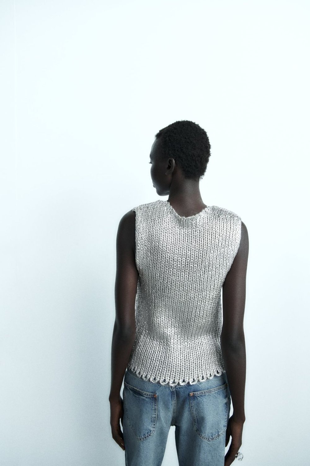 Prvenstveno se ističe tkaninom s metalnim nitima istaknutom pripijenim dizajnom u znaku okruglog ovratnika. Bez dodatka rukava, ovo sjajno pletivo po cijeni od 30 eura osvaja elegantnim dojmom, ali i svojom svestranošću. Kako je Zarin tim demonstrirao u web trgovini, ovo pletivo izgleda posebno neodoljivo u kombinaciji s bazičnim komadima poput traperica.