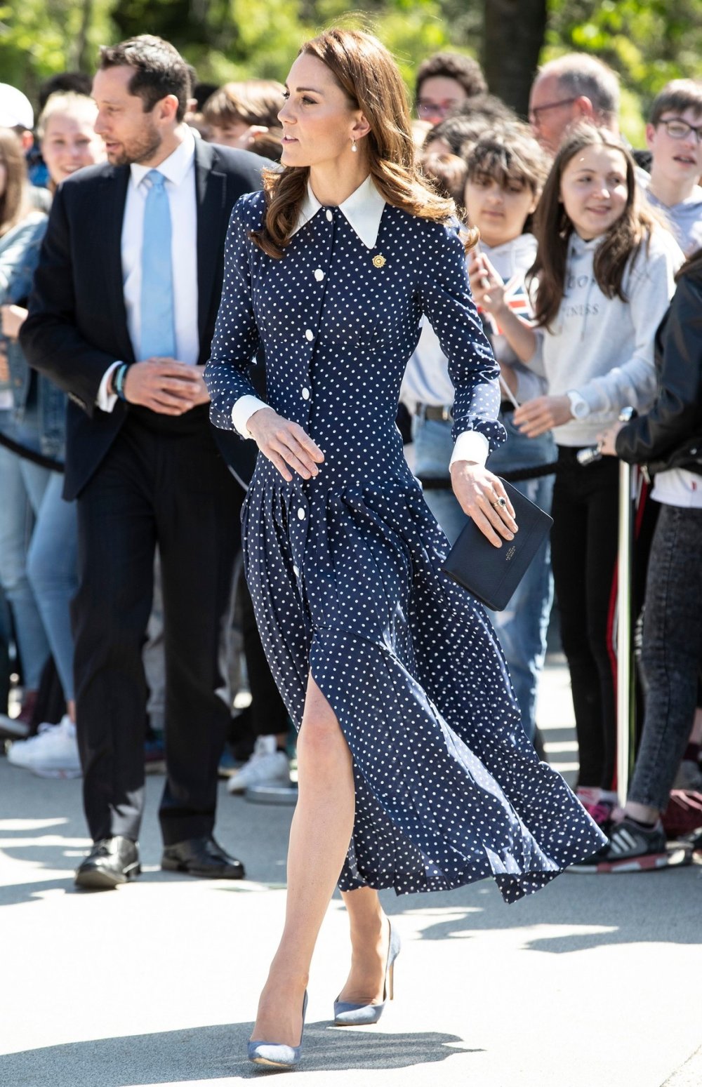 Tada je Kate Middleton izabrala dugi, tamnoplavi model Alessandre Rich s nježnim bijelim točkama, naglašenim strukom, lepršavom suknjom i ovratnikom koji formira V-izrez, estetikom koja diskretno odaje počast eleganciji sredine 20. stoljeća u suvremenoj interpretaciji.