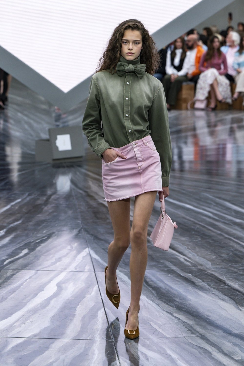 Jedna od najupečatljivijih revija sezone, debitantska kolekcija Jonathana Andersona za Dior, uključila je pastelnoružičastu mini suknju od trapera. Dizajner ju je uskladio s torbom u istoj nijansi, a kombinacija s kaki zelenom pokazala je da se i neočekivani spojevi mogu itekako isplatiti.