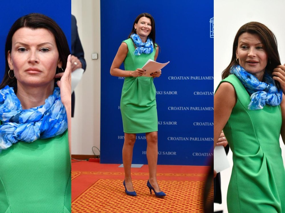 Iako idemo u susret jeseni, Glasovac se odlučila za vedru haljinu bez rukava u zelenoj boji duljine tek iznad koljena koju je upotpunila s upečatljivim šalom oko vrata u plavim tonovima i stiletticama od brušene kože u istoj nijansi plave.
