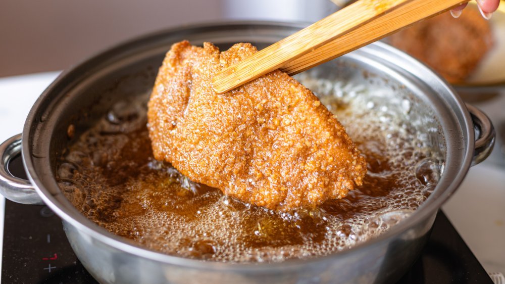 - U tavi zagrijte ulje na 175 °C i pržite meso 3–4 minute sa svake strane dok ne dobije zlatno smeđu boju. Šnicle prebacite na tanjur obložen papirnatim ubrusom kako bi se upio višak masnoće.