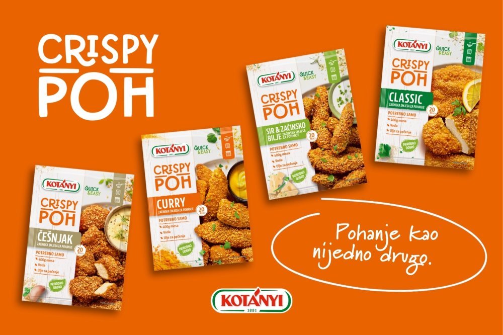 Zaboravite klasično, neuredno i stresno pohanje i upoznajte male Kotányijeve pomagače za pripremu savršeno hrskavih pohanaca, koji dolaze u četiri različita okusa. Crispy POH Classic je, kao što mu i naziv govori, čisti klasik. Hrskava, zlatna korica s blagim, uravnoteženim začinima koji savršeno pašu uz meso ili ribu. Crispy POH Curry ima tople, aromatične note orijentalnih začina uz blagu pikantnost. Intenzivniji okus, hrskavu teksturu i bogatu aromu koja odlično ide uz piletinu, ribu ili povrće pruža Crispy POH Češnjak, a blažu i savršenu kombinaciju sira i aromatičnog mediteranskog začinskog bilja koje se sjajno slažu s piletinom ili ribom daje Crispy POH Sir i začinsko bilje.