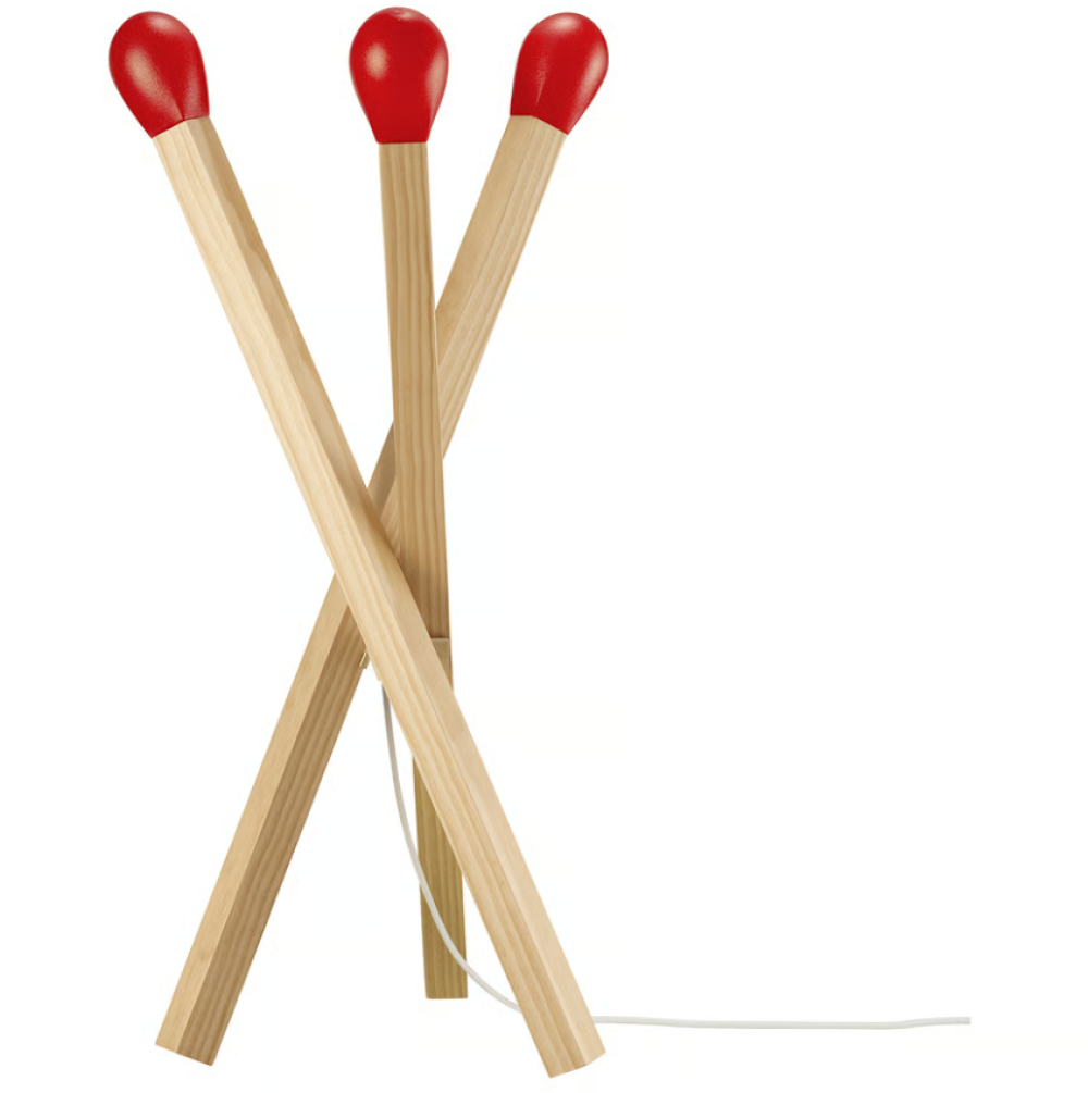 Lampa STRÅLA sastoji se od tri noge izrađene od punog borovog drveta, oblikovane poput šibica s crvenim LED vrhovima koji emitiraju toplo, prigušeno svjetlo.