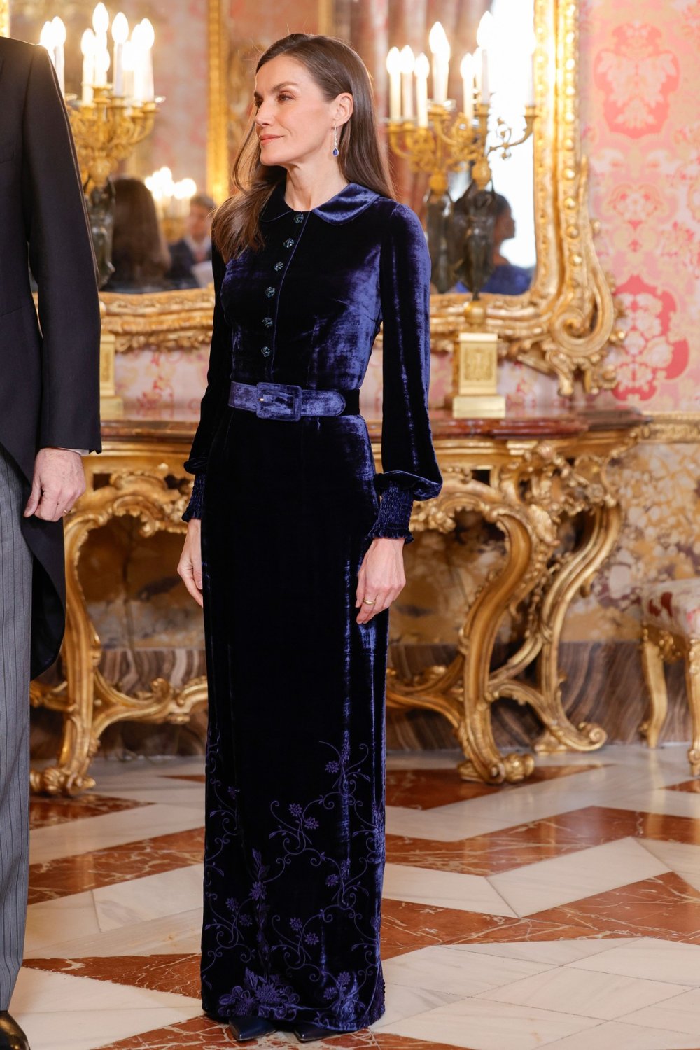 Haljina od tamnoplavog baršuna, dugih rukava i maxi duljine, ističe se svojom klasičnom, ali luksuznom siluetom: zanimljivom kragnom, nizom svjetlucavih gumba na prednjem dijelu i remenom od iste tkanine koji savršeno naglašava figuru. Baršun kao materijal dodaje dubinu i raskoš, a idealan je za svečane prilike poput ove, s predstavnicima 126 veleposlanstva i gotovo 800 konzulata akreditiranih u Španjolskoj. Kraljica je kombinaciju upotpunila plavim naušnicama od safira, koje nosi od 2017. godine, te crnim salonkama s potpeticom od oko četiri centimetra, što je najbolji izbor zbog njezinih problema s Mortonovim neuromom.