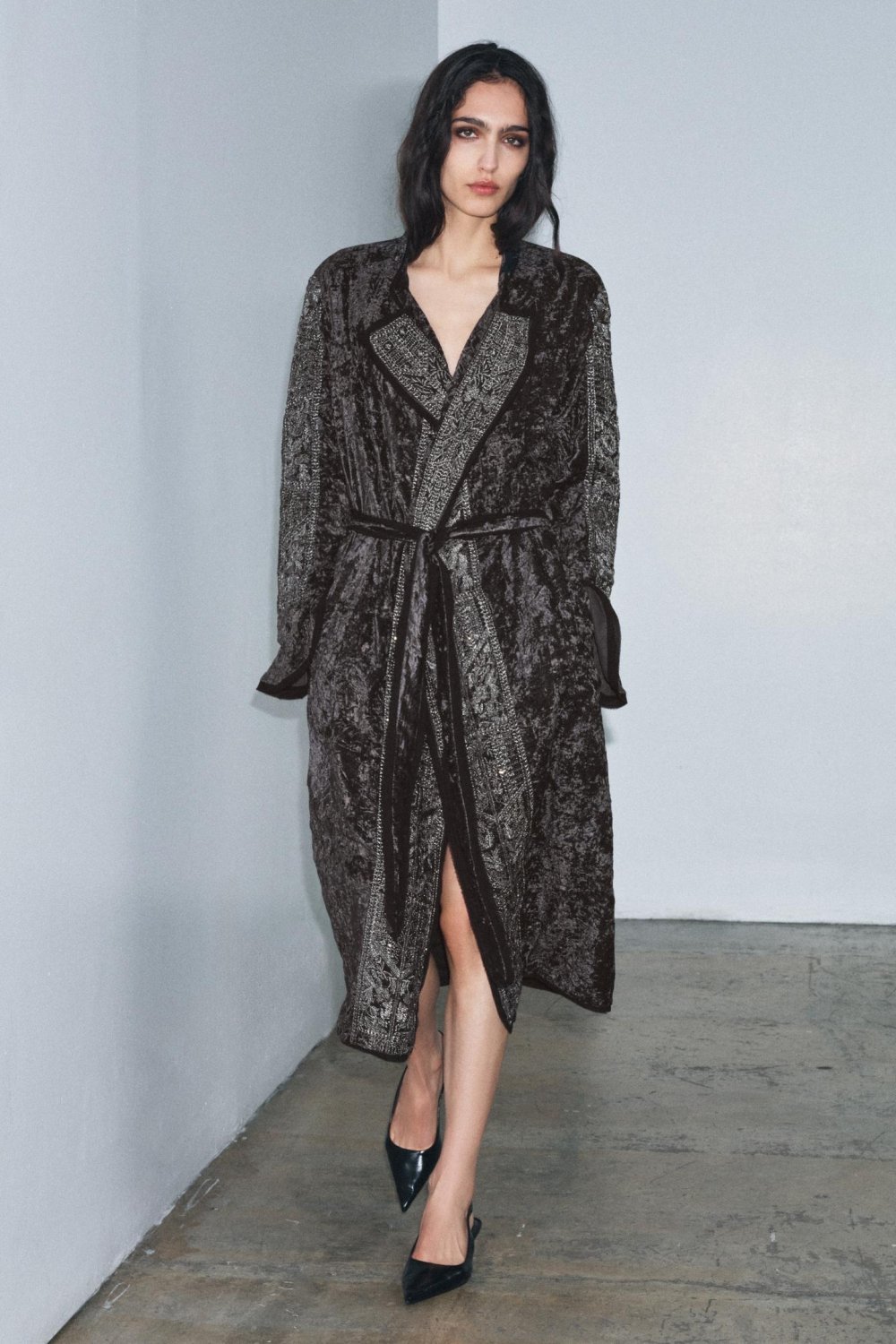 Jedan od najupečatljivijih komada iz nove ponude je dugi kaput u kimono stilu od luksuzne tkanine, ukrašen detaljima koji podsjećaju na nakit i koji odmah dižu cijeli styling. Urednica mode ga nosi vrlo minimalistički: bijela T-shirt majica, crne izblijedjele široke traperice i visoke potpetice, kako bi kaput u potpunosti došao do izražaja.