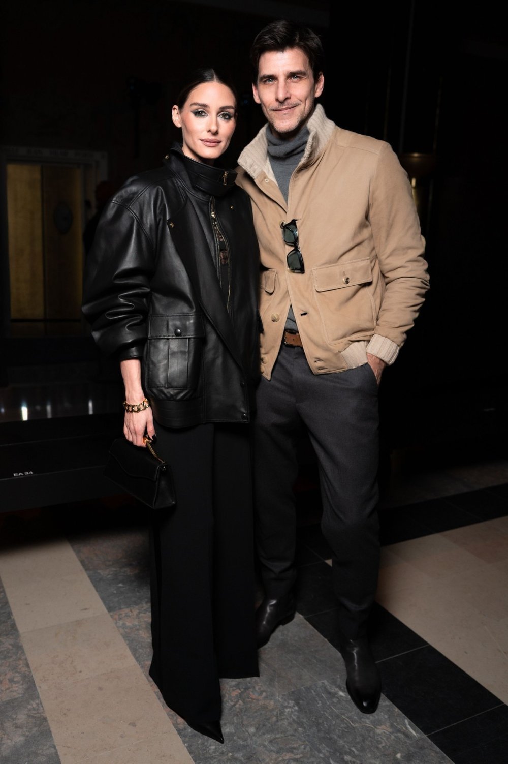 U kombinaciji s toplom bež nijansom, siva baza i tamne hlače stvaraju mušku verziju monokromatske elegancije, dovoljno blisku Olivijnoj crnoj 'uniformi' da zajedno izgledaju usklađeno.