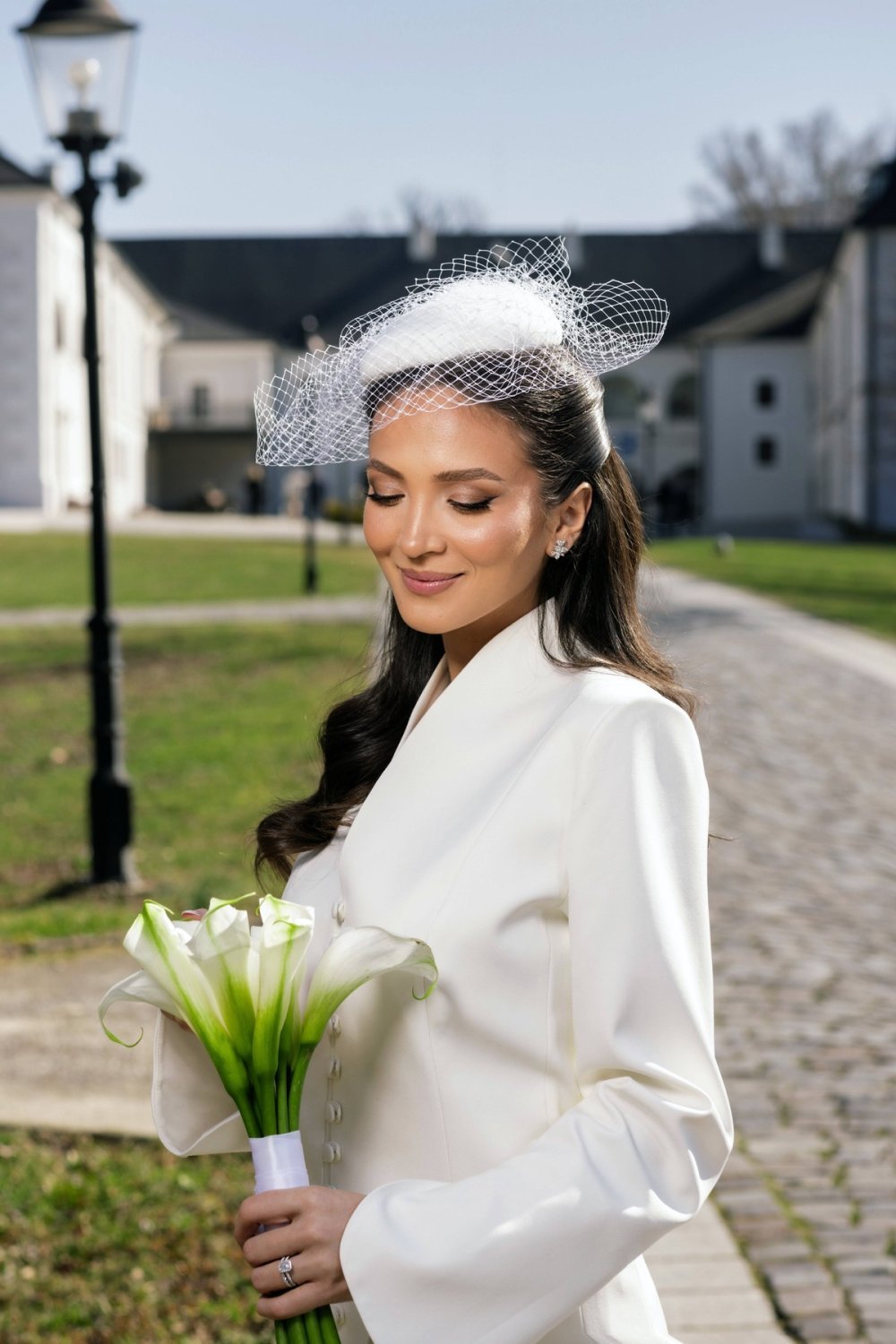 Vjenčano izdanje podigla je bijelim fascinatorom na glavi s dodatkom mrežice, dok se po pitanju obuće opredijelila za bijele salonke u špic Jimmyja Chooa, sa efektnim detaljem svjetlucavog remenčića.