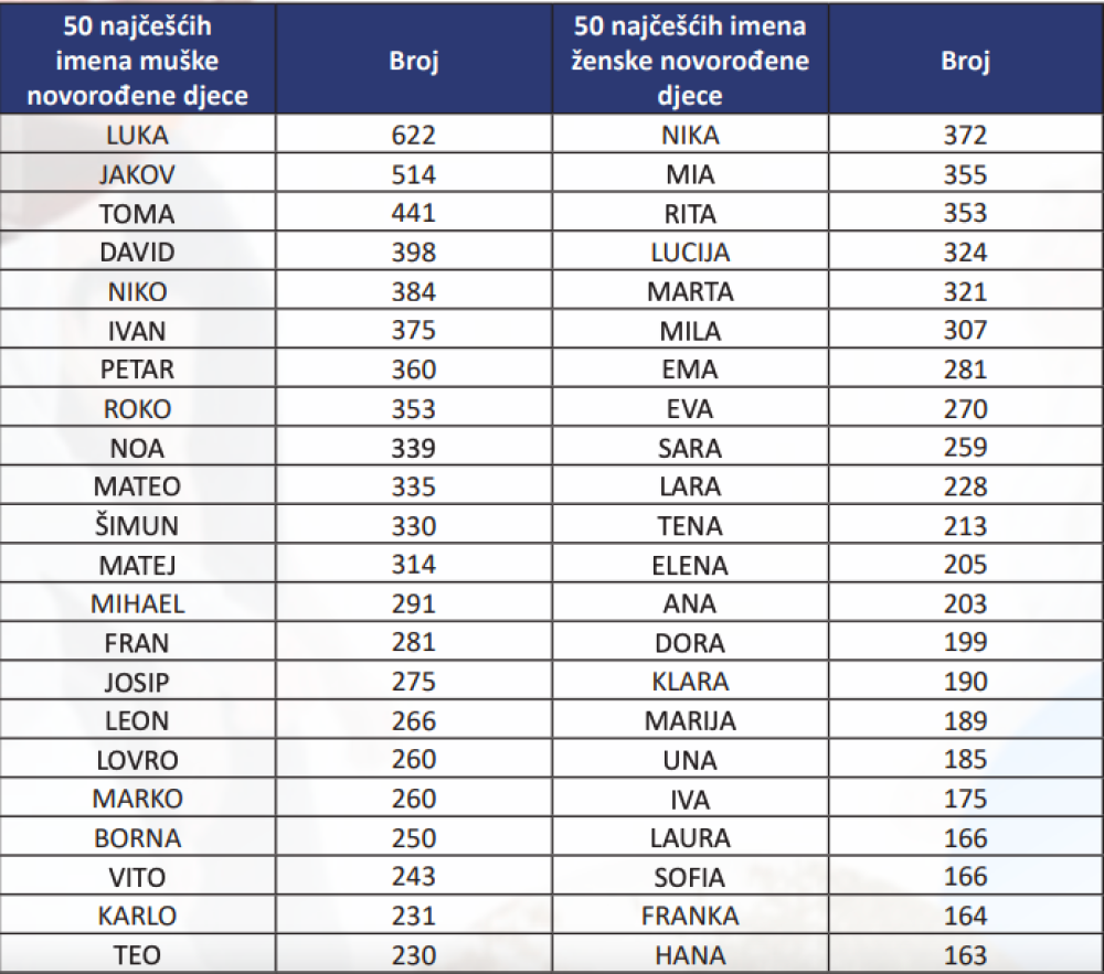 Kada je riječ o imenima, vrh ljestvice i dalje drže dobro nam znana imena, iako se na listu 'prikralo' nekoliko novih. Tako su na listu upala imena Andrija, Matija, Erik, Kaja, Luce, Lora i Dunja.
