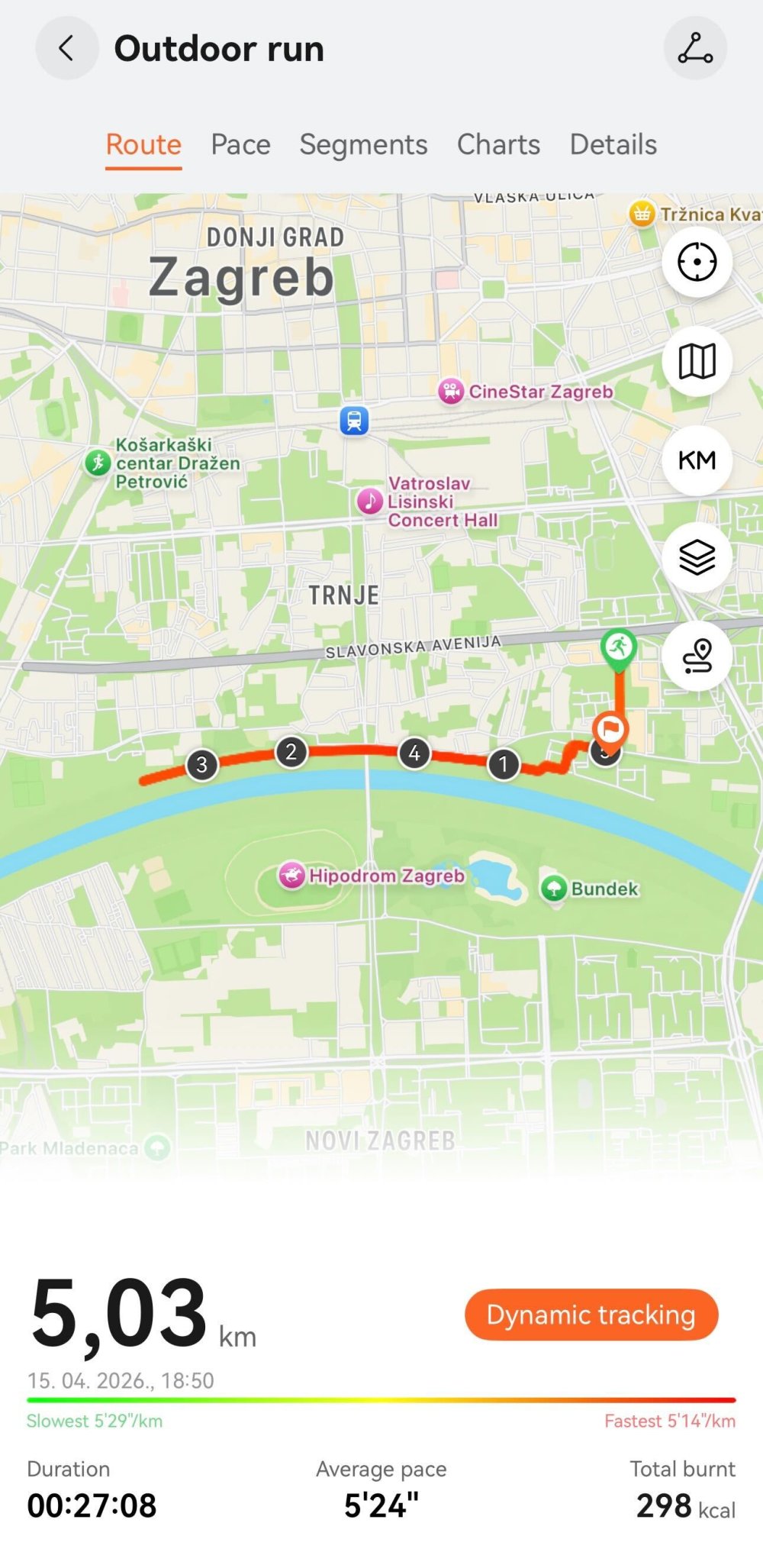 Za naš prvi proljetni izlazak na zagrebački nasip odlučili smo se za kraću rutu od pet kilometara i tempo oko 5:20 min po kilometru. To je bio početak povratka u formu, ali i dobra provjera trenutačnog stanja – koliko se može držati ritam, kako tijelo reagira i koliko je daleko cilj koji je postavljen za rujan. Upravo na temelju takvih treninga sat može preciznije procijeniti trenutačnu spremnost i pokazati koliko je cilj realan. Kad se cilj jednom postavi, sat više ne služi samo za bilježenje aktivnosti, nego kao svojevrsni vodič na zapešću – tijekom trčanja može upozoriti da ste krenuli prebrzo, pomoći da ostanete u održivom ritmu, pratiti odstupate li od planiranog tempa i pokazivati kako stojite s procijenjenim vremenom završetka. Uz to, kod dužih treninga ili simulacije utrke može podsjetiti na hidraciju i nadoknadu energije, što je često razlika između dobrog osjećaja u finišu i potpunog pada ritma.