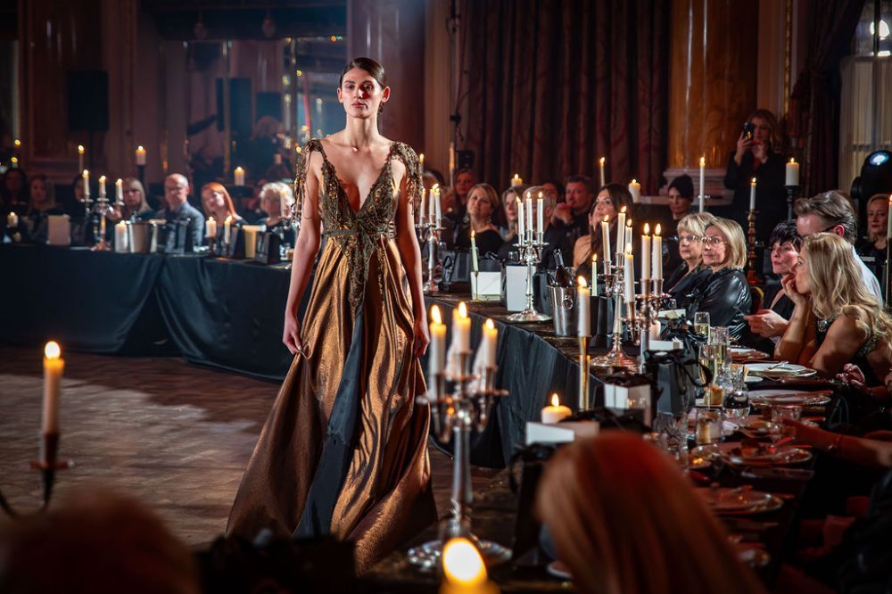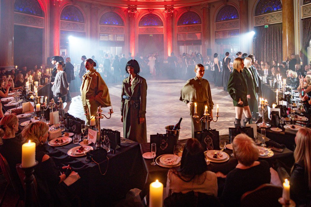 Večer je započela atmosferom koja je osvojila prostor i publiku prije samog izlaska modela na pistu. Uzvanici su sjedili u dva monumentalna, savršeno simetrična kruga raskošno stiliziranih stolova, uronjeni u more mirisnih svijeća čije je zlatno svjetlo definiralo intimnu, ali moćnu scenografiju. Niski, baršunasti dim klizio je dvoranom, brišući granice između stvarnosti i filma te stvarajući snažan, gotovo kinematografski doživljaj. U tom pažljivo režiranom ambijentu Hippy Garden je predstavio svoju prepoznatljivu viziju žene — samouvjerene, urbane i sofisticirane.
