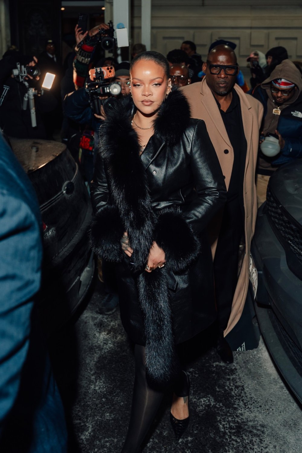 Rih je odabrala izdanje koje ne može biti svježije s piste – dugačku kožnu jaknu AWGE s remenom spuštenim nisko na bokove i čupavim manšetama. Stilizirala ju je slojevima zlatnih i dijamantnih ogrlica, visećim naušnicama, predimenzioniranim uglatim sunčanim naočalama, crnim teksturiranim salonkama i spomenutim prozirnim najlonkama bez stopala. Na mnogo načina, dodavanje tog dodatnog sloja bila je sasvim pragmatična Rihannina interpretacija looka iz proljetne kolekcije.