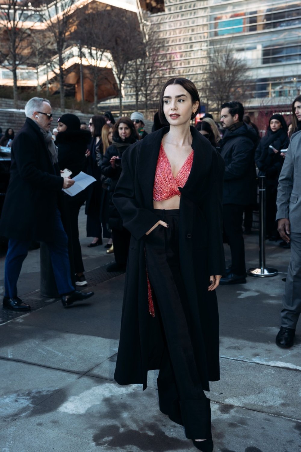 Dugi crni kožni kaput koji je Lily Collins nosila za fotografiranje za naslovnicu potpisuje Izabel Kovačić