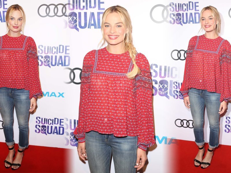 U društvu kolega i nakon niza pojavljivanja u zanimljivim haljinama u povodu promocije filma, Margot Robbie ovaj je put zablistala u netipičnoj hipijevskoj kombinaciji od bluze njujorške dizajnerice Ulle Johnson čije haljine zvijezde obožavaju nositi. Trendovsku bluzu kombinirala je s uskim trapericama podvrnutih i nedovršenih rubova nogavica koje su pružale pogled na jednostavne crne sandale minijaturne blok-pete i remenčiće ukrašene zlatnim kopčama. Ovo netipično casual izdanje za crveni tepih zaokružila je trendovskom nemarnom pletenicom i minimalnim make-upom kojim je istaknula prirodnu ljepotu.