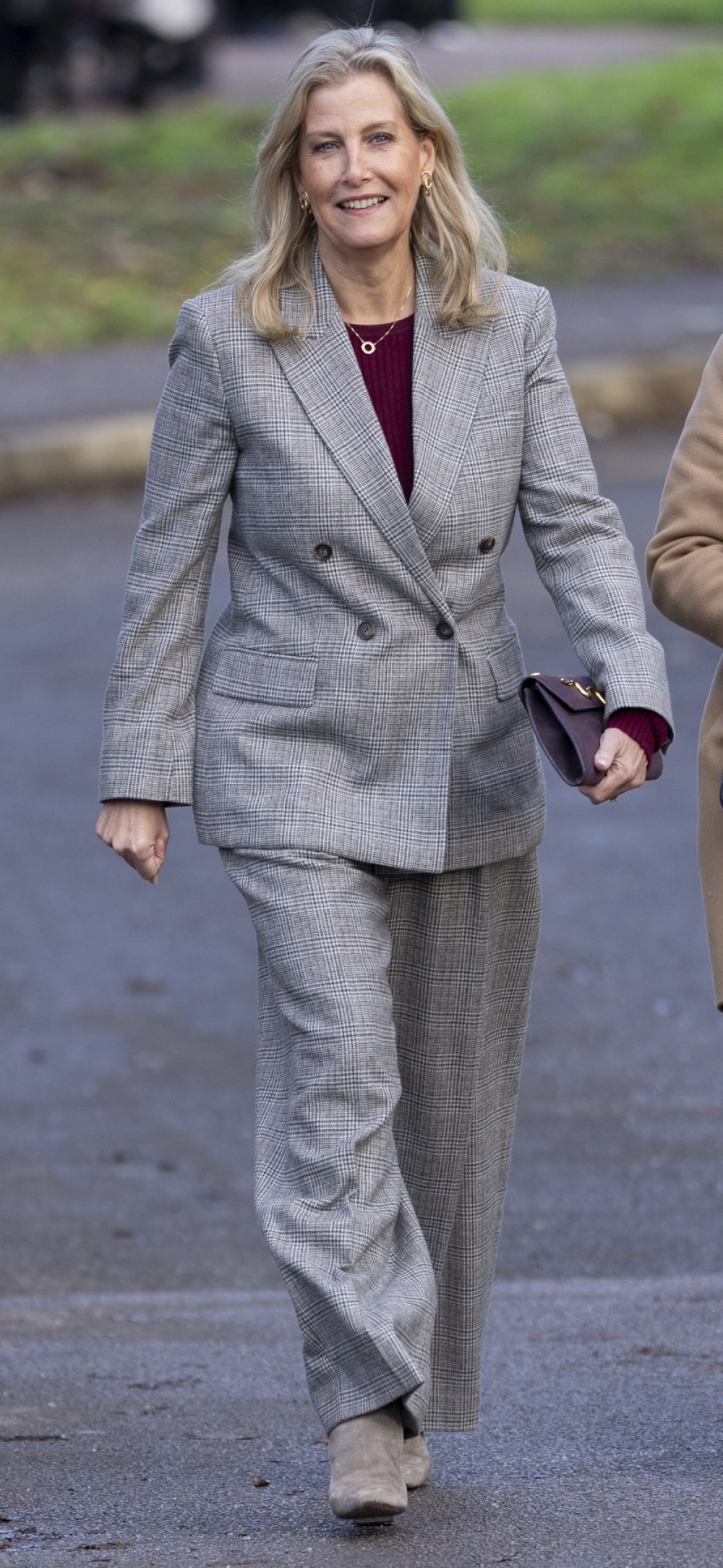 Stajling je zaokružila svijetlim gležnjačama na petu u nijansi pijeska koje su se vizualno stopile s hlačama te su dodatno njezinu figuru učinile vitkijom. Nije pretjerivala s make upom, dok je kosu nosila stiliziranu u vrlo jednostavnu frizuru s blago uvijenim krajevima. Kombinacija strukturiranog odijela, udobnog pletenog topa u boji burgundca i minimalističkih dodataka savršeno oslikava Sophien prepoznatljiv stil: odmjeren, praktičan i nosiv, ali uz dovoljno modnih detalja da svaka poslovna kombinacija izgleda svježe i moderno.