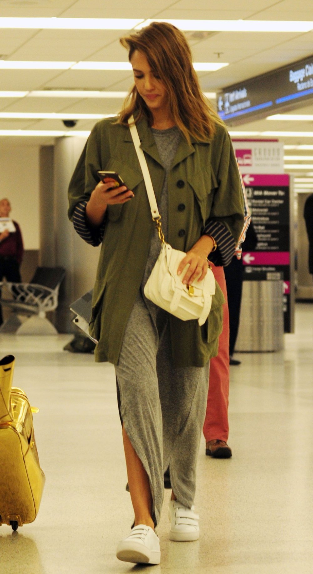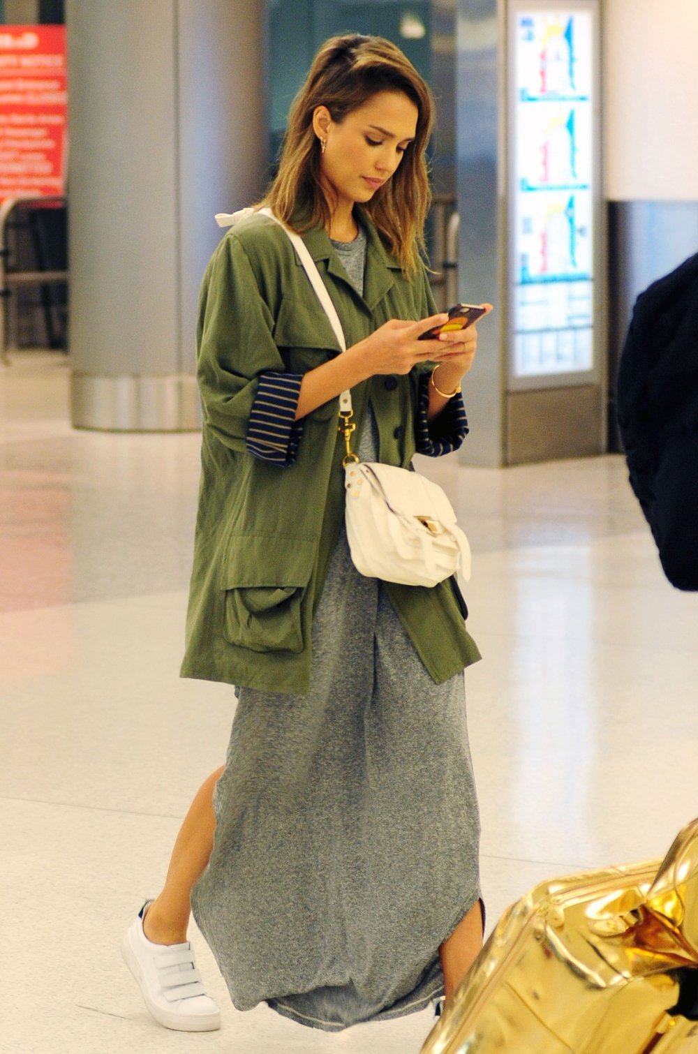 Jessica Alba već godinama ne silazi s lista najbolje odjevenih holivudskih glumica. Iako stilom uvijek oduševljava na crvenom tepihu, najveću pažnju dobiva u svakodnevnim, casual izdanjima. Prilikom slijetanja u zračnu luku u Miamiju, uočena je u trendi military jakni brenda Smythe i dugoj jersey haljini brenda The Great. Vojnički stil kojem nije odoljela ni prelijepa Jessica veliki je modni trend koji su prigrlili i u svojim kolekcijama predstavili slavni dizajneri poput Marca Jacobsa i Ralph Laurena.