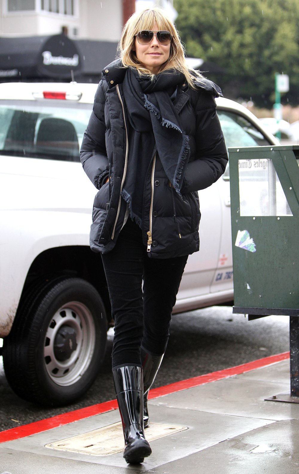 Prelijepa Heidi Klum zna kako se obući udobno i šik, a ovaj put modni recept sasvim je jednostavan: crne gumene čizme, koje su hit i kod nas, kombinirala je s uskim crnim hlačama. Uz to idu zimska sportska jakna i lagani crni šal.
