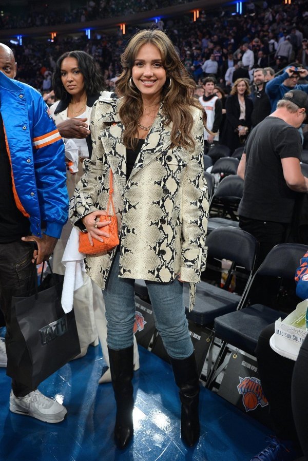 Za utakmicu Miami Heata i New York Knicksa lijepa je Alba odjenula uske traperice koje je ugurala u visoke crne čizme, a pažnju je svakako privukao i oversized sako u printu zmijske kože.
