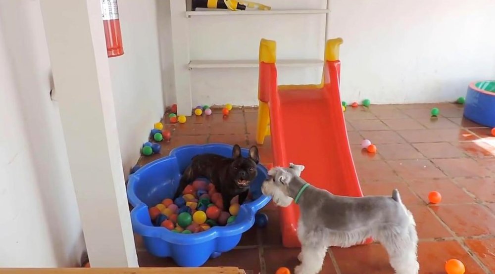 Drugi psi podjednako su iznenađeni buldogom koji neumorno trči od jednog do drugog bazena s lopticama. Iako bi mu vjerojatno više godila dobra šetnja parkom, pretpostavljamo da su i šarene loptice u igraonici bolje nego da kod kuće uništava papuče.