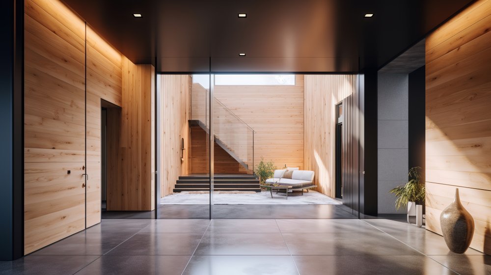 U velikim kućama prijelazni prostori poput ulaza često znaju djelovati bezlično, no ovdje je situacija drugačija. Prirodno svjetlo koje dolazi kroz velike staklene površine unosi toplinu, dok pogled prema van pomaže prostoru da ostane povezan s okruženjem.