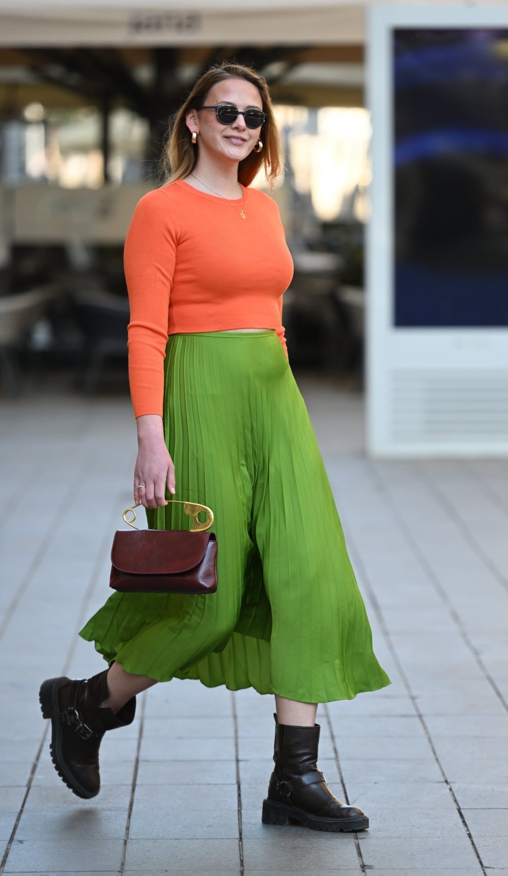 Rebrasti, pripijeni top u snažnoj narančastoj nijansi savršeno je istaknuo siluetu, dok je lepršava, plisirana suknja u travnato zelenoj boji unijela dinamiku i lakoću u hodu.