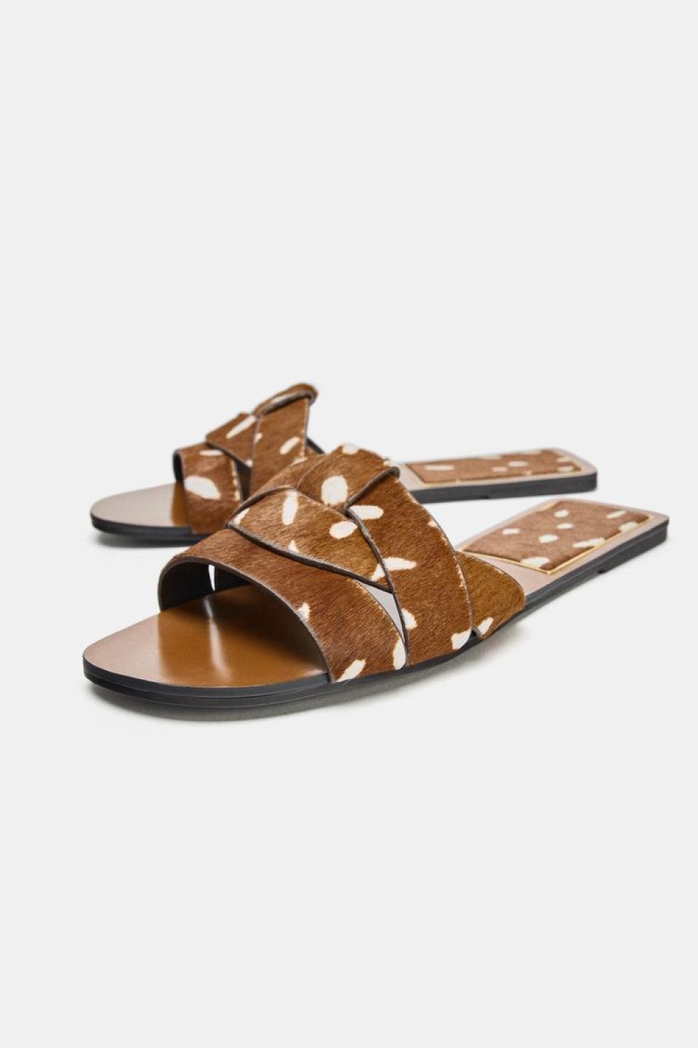 Upravo takav par pronašli smo u Zari. Riječ je o ravnim sandalama od kože s krznom u smeđoj boji, dodatno osvježenima bijelim točkicama koje im daju razigran i pomalo retro prizvuk. Zahvaljujući tom spoju boje i uzorka, djeluju efektno, ali ne i prenapadno, što ih čini zahvalnim izborom za niz proljetnih prilika.
