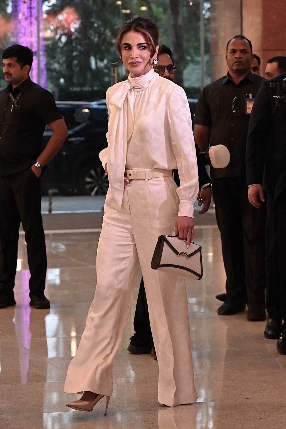 Rania je odabrala 'slonovača look od glave do pete', a on je gotovo savršena definicija onoga što se danas u modi naziva tihi luksuz: diskretno, skupocjeno, bez potrebe za dokazivanjem... Svilenoj bluzi s efektnim pussy-bow ovratnikom i suptilnim, gotovo neprimjetnim uzorkom u obliku cvjetnih motiva savršeno su odgovarale široke hlače visokog struka s ravnim, čistim krojem i izrazito dugim nogavicama, gotovo do poda.