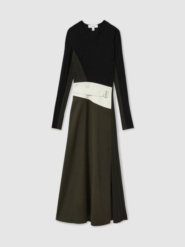 Glavna posebnost ovog modela leži u tehnici color block postignutoj kombinacijom materijala u neutralnim bojama. Bijela boja na struku podebljana je dodatkom pojasa koji je naglasio laskavi efekt same haljine, dok je donji dio činio kombinaciju tkanina maslinasto zelene i tamno sive boje.