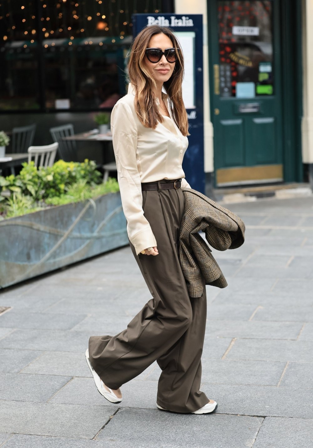 Detalj koji mnogi možda ne bi ni primijetili, a upravo cijelu kombinaciju uzdiže na drugu razinu je elegantan sako u smeđim i bež tonovima koji Myleene ne nosi, već ga drži rukom kao nonšalantni modni dodatak. To je stari trik stilista – nositi komad odjeće kao da ga niste 'planirali', ali da je savršeno ukomponiran u cijelu sliku.