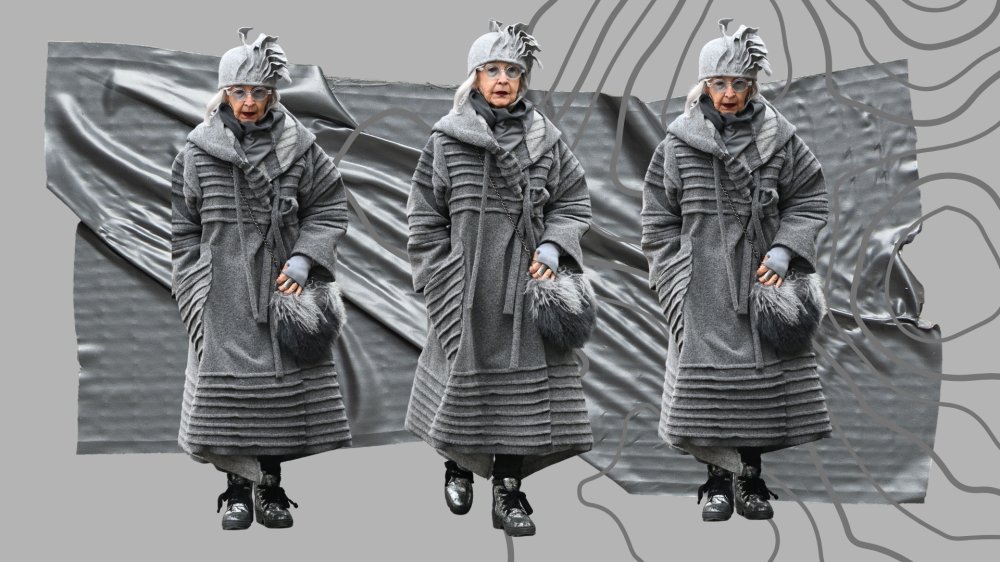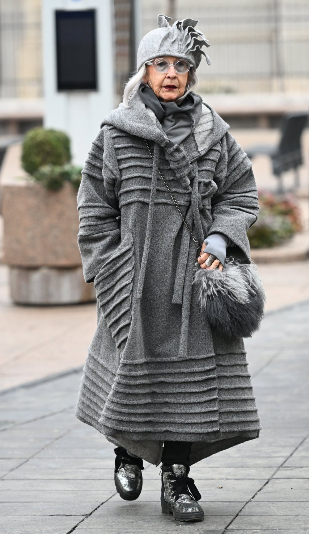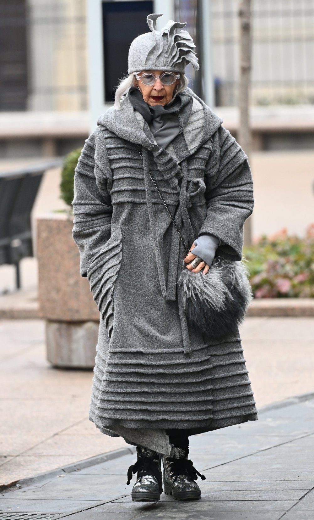 Kaput prati voluminozna, gotovo kiparska kapa s drapiranim, valovitim detaljem koji se nastavlja na kapuljaču i dodatno naglašava Mirjaninu sijedu kosu, pa cijeli outfit djeluje kao promišljena igra linija i slojeva.