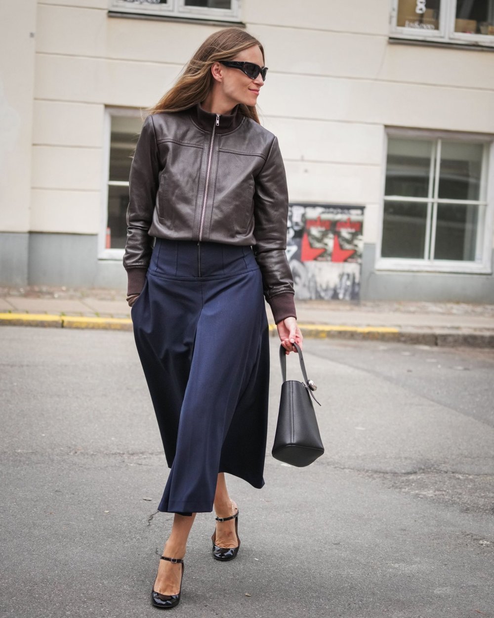 Dizajnerica često pokazuje da riskiranje nije nužno. Okrugli pulover, komad koji redovito nosi, i elegantna suknja šireg kroja stvaraju njezin prepoznatljiv, smiren look. Jednostavno, ali efektno.