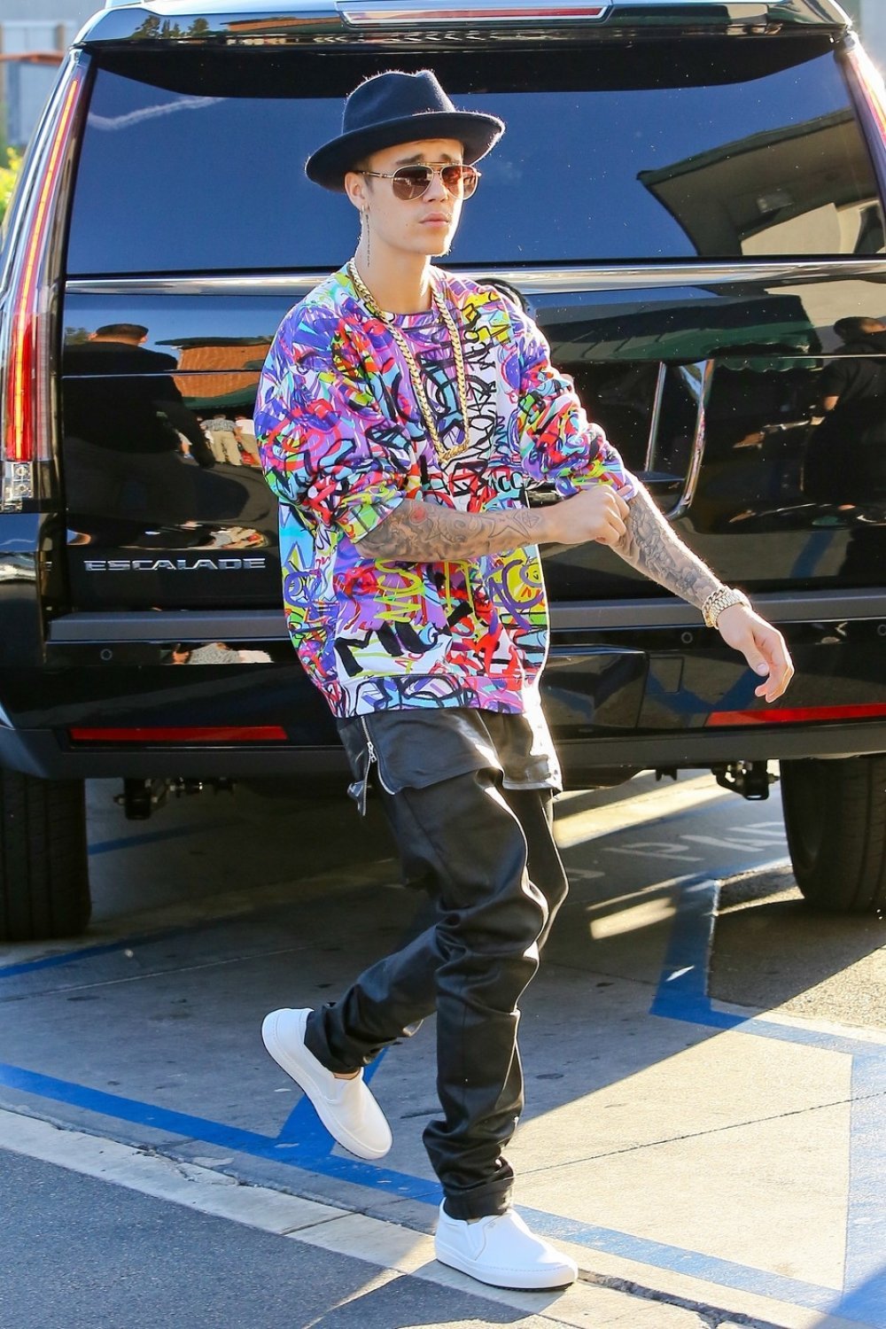 Ovoga puta to nije bio slučaj: odlučio se upadljivu majicu vrištećih boja, kožne 'haremske' hlače, tenisice i šešir 'fedora'.
