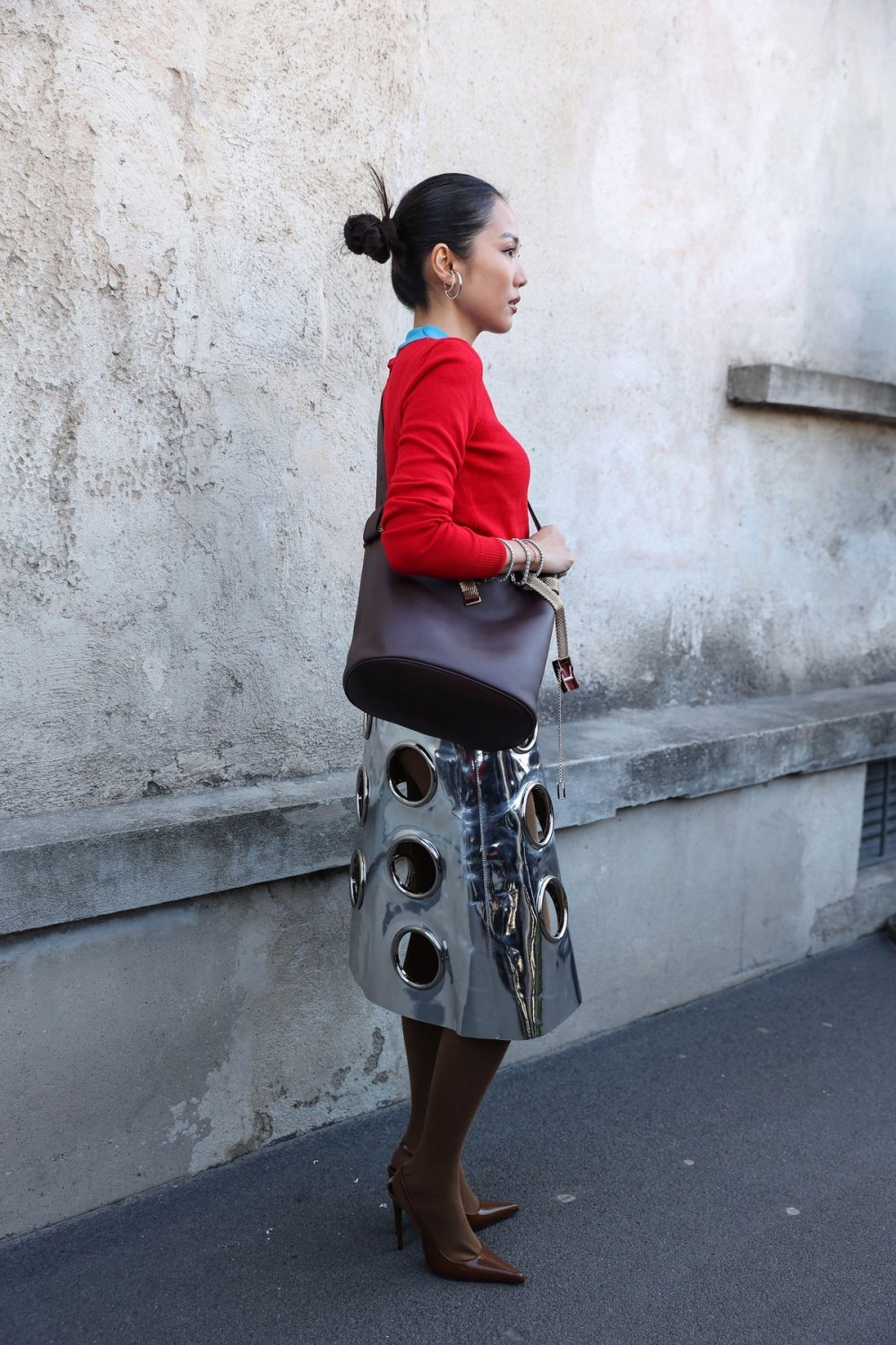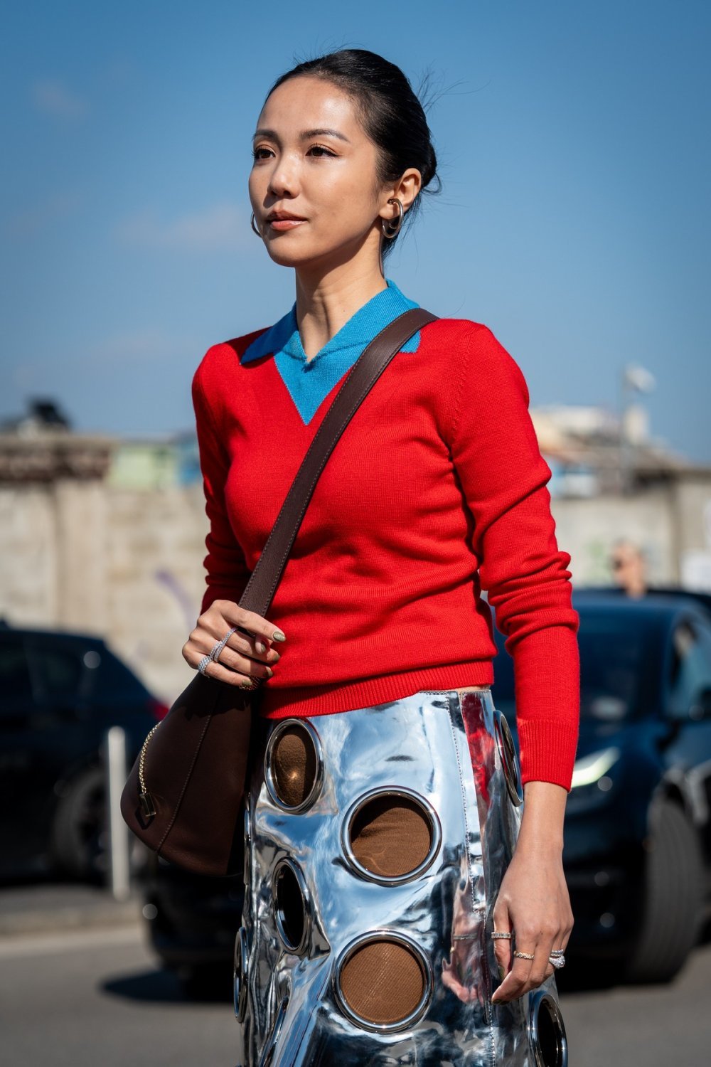 Sve je počelo kod Prade, na jednoj od najupečatljivijih revija sezone. Miuccia Prada pokazala je crnu suknju A-kroja od lakirane kože s futurističkim detaljima nalik otvorima svemirskih letjelica. Njena struktura inspirirana šezdesetima spajala je retro romantiku i modernistički minimalizam, dok su slojevi pletiva i blago damski stajling ublažili fetišističku notu visokog sjaja.