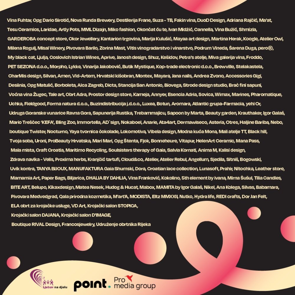 Posjetitelji će moći birati među raznolikom ponudom – od odjeće, obuće, torbica i modnih dodataka, do nakita, prirodne kozmetike, ručno rađenih sapuna, craft proizvoda, vina, likera te dekorativnih predmeta poput svijeća, ukrasa i keramike. Idealna prilika za pronaći nešto posebno za sebe ili za darivanje, a istovremeno pomoći onima koji se svakodnevno bore s najtežim izazovima.