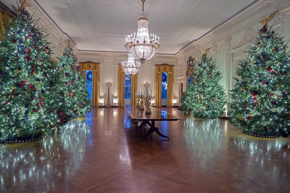 - Istočna soba: Odaje počast nadolazećem 250. rođendanu Amerike, uz drvca ukrašena crvenim, bijelim i plavim ornamentima.
