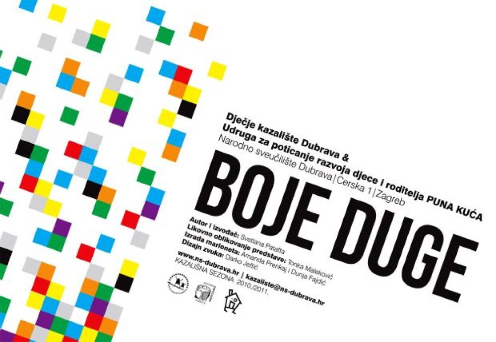 Proizvod fokusiranog angažmana Svetlane Patafte kao majke, glumice i dramske pedagoginje u kreativnom radu s djecom najmlađe dobi, predstava je inspirirana je motivima iz priče 'Duga' Manuele Vladić Maštruko.
