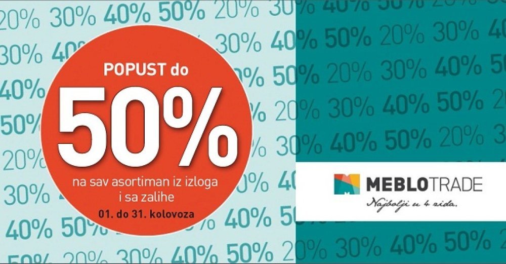 Zbog preuređenja izloga i prispjeća novog asortimana, u svim Meblo Trade salonima u tijeku je rasprodaja izložbenih eksponata i artikala sa zalihe sa popustima od 20-50%, pa čak i do 70%.