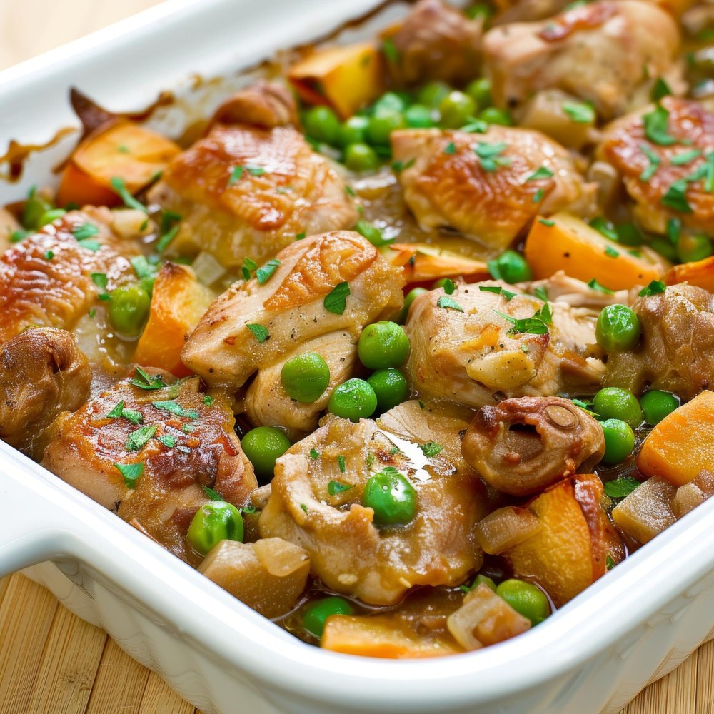 Ovo je recept koji podsjeća na nedjeljni ručak, ali bez puno kompliciranja. Sve se peče zajedno, a umak nastaje gotovo sam od sebe, dok se piletina karamelizira, a povrće upija sokove i aromu senfa, limuna i češnjaka.