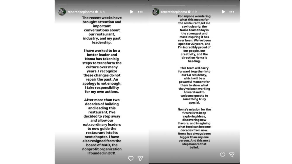 U objavi na Instagramu Rene Redzepi je poručio da su posljednji tjedni otvorili važne razgovore o restoranu Nomi, industriji i njegovu nekadašnjem načinu vođenja. Priznao je da isprika nije dovoljna te poručio da preuzima odgovornost za vlastite postupke.