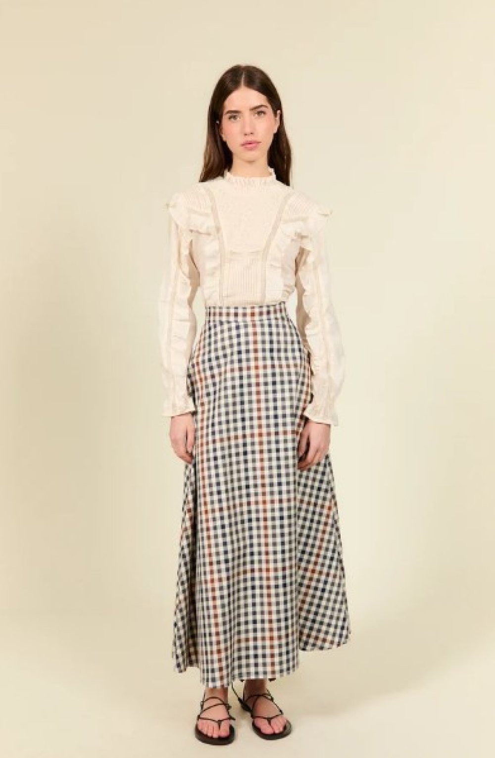 U modnom svijetu već je dobro poznato da se sezone dijele prema uzorcima. Dok jesen i zima pripadaju tartanu, topliji mjeseci rezervirani su za nježnije i prozračnije varijante kariranog uzorka, poput vichyja. Sassa de Osma odlučila se upravo za takav pristup. Nosila je usklađeni komplet suknje i laganog kaputa s kariranim motivom, čime je postigla skladan i elegantan izgled koji je istovremeno dovoljno ležeran za svakodnevne prilike.
