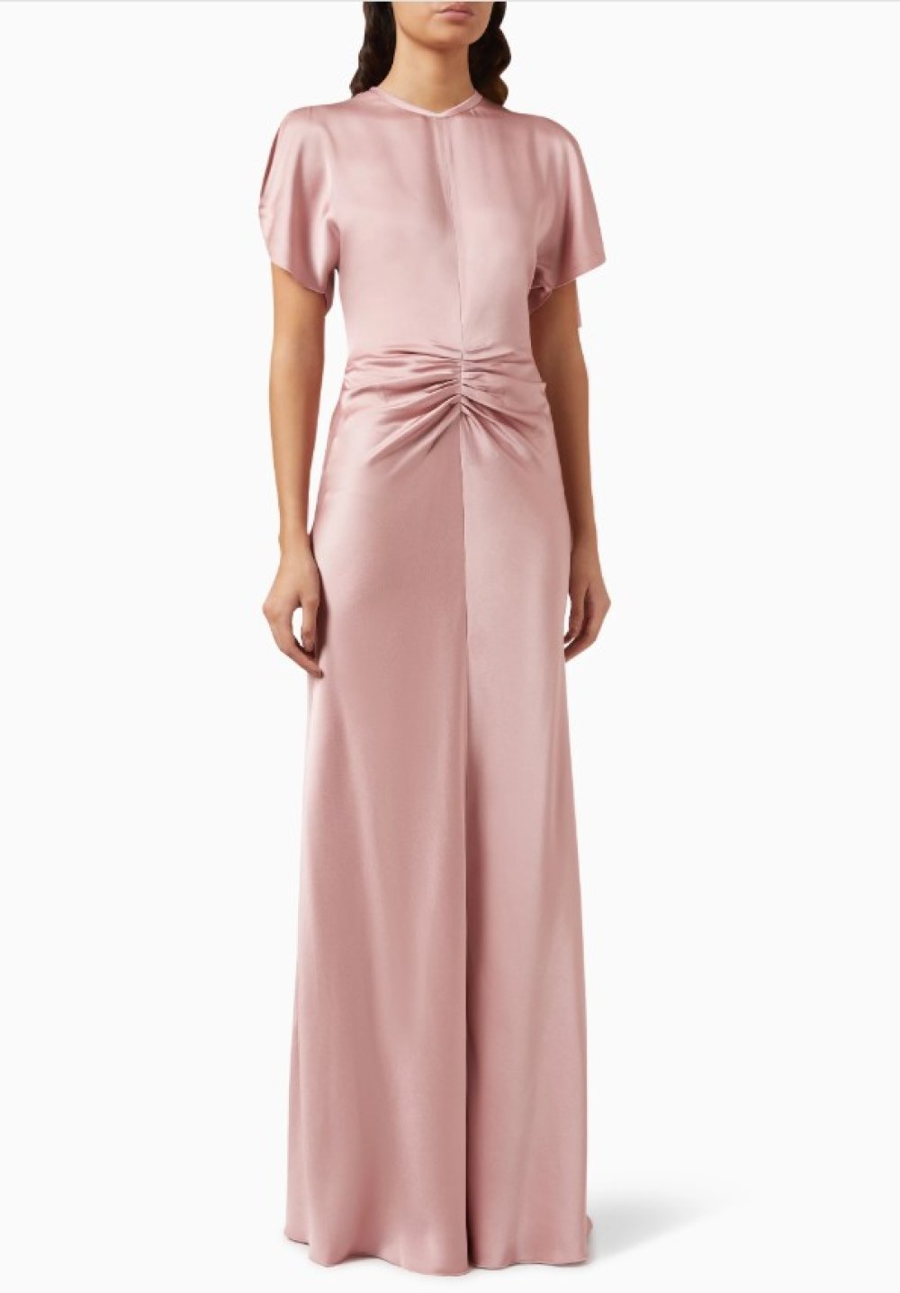 Za intimnu proslavu odabrala je očaravajuću ružičastu haljinu od satena s potpisom Victorije Beckham, čija cijena iznosi 1 550 američkih dolara. Sofisticirani kroj s nježnim naborima na trbuhu, kratkih lepršavih rukava i maksi kroja savršeno je prilagođen ženstvenoj silueti i odlično prikriva trudnički trbuščić, što ga čini idealnim izborom za buduće mame koje i dalje žele izgledati besprijekorno.