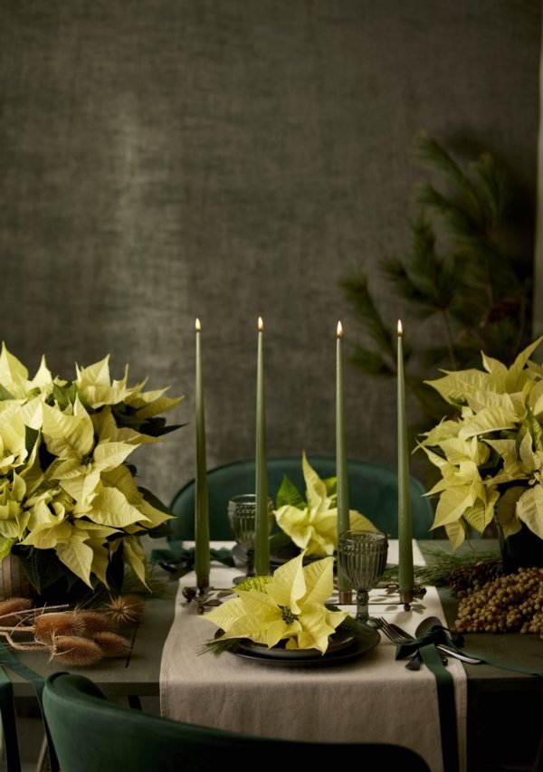 Ukrasi u tamnim, toplim nijansama zelene djeluju umirujuće i stvaraju opušteno raspoloženje, a uz to su u prekrasnom kontrastu s briljantnom kremasto bijelom božićnom zvijezdom. Priuštite svojim gostima blistavu dobrodošlicu stavljajući na tanjure ukrase od rezane krem božićne zvijezde. Savjet: Kako biste izbjegli kontaminaciju, omotajte krajeve stabljika zelenom cvjetnom trakom ili ih stavite u cvjetnu tubu napunjenu vodom.