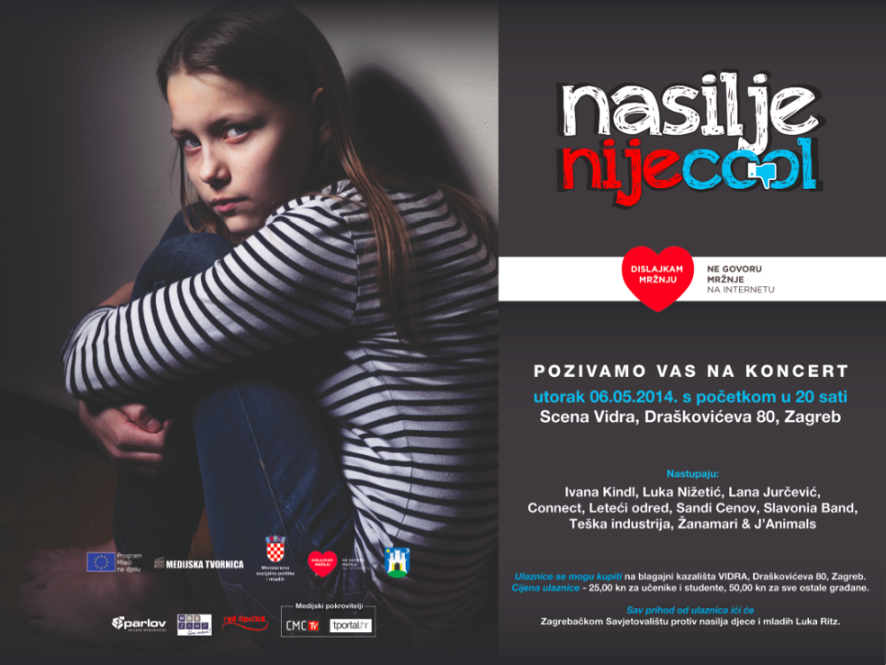 Projekt 'Nasilje nije cool' koji udruga Medijska tvornica provodi po školama diljem Hrvatske posljednjih godinu dana, a čiji je cilj edukacija i prevencija vezana uz temu cyberbullyinga i govora mržnje na internetu, završava svoje aktivnosti velikim koncertom protiv nasilja. Koncert 'Nasilje nije cool' čiji će prihod ići Savjetovalištu protiv nasilja djece i mladih Luka Ritz održat će se u zagrebačkom kazalištu Vidra u utorak, 6. svibnja s početkom u 20 sati