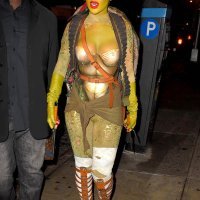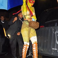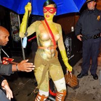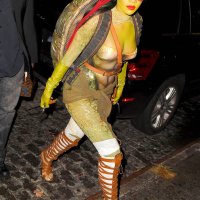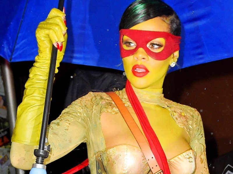 Crvena maska na njezinom licu, baš kao i uzorak kornjačinog oklopa na njezinom kostimu, otkrivali su da se Rihanna prerušila u jednu od ninja kornjača - konkretno Rafaela. Stajling je upotpunila gladijatorskim čizmama na visoku petu.