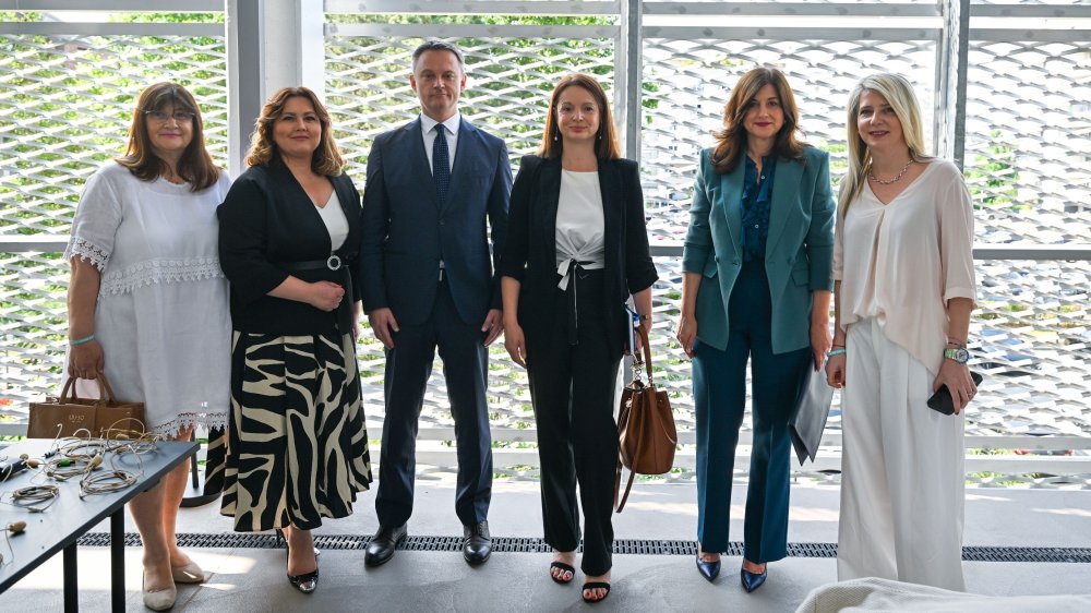 Frizura je bila uredno stilizirana u blage valove, što dodatno omekšava strogoću poslovnog outfita i daje dozu prirodne elegancije. Šminka je bila diskretna, s naglaskom na prirodan ten i crvene tonove ruža, što je čest odabir Sanje Musić Milanović i u drugim javnim prigodama.
