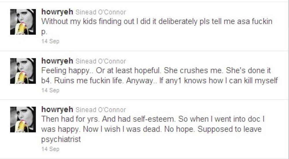 Danas medijski neeksponirana i gotovo zaboravljena pjevačica, 44-godišnja Sinead O'Connor, u srijedu je nakon posjeta psihijatrici na Twitteru ostavila uznemirujuće poruke u kojima govori da bi najradije izvršila samoubojstvo.