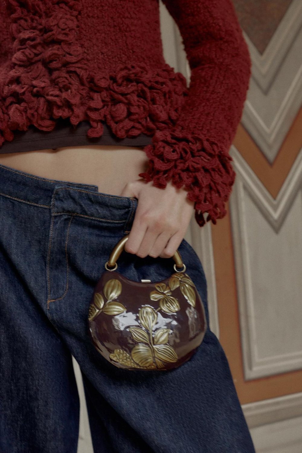 Torbica u obliku kutije s cvjetovima u tamnoj boji izgleda kao da je izravno iz otočnog vrta, ali u sofisticiranoj verziji. Cvjetovi u reliefu na tamnoj podlozi čine ovu torbicu iznenađujućim, ali ne previše prekomjernim dodatkom. Izvrsno se kombinira s zemljastim tonovima, tamnozelene boje i satenskim haljinama. Ova torbica je pravi dragulj za one romantične i bukolike duše.