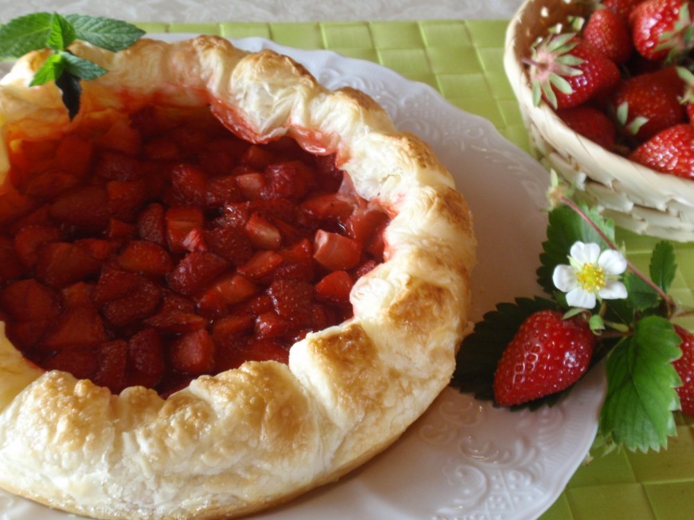 Od lisnatog tijesta izrezati krug 3-4 cm promjera veći od kalupa za pečenje. Složiti u kalup, uliti nadjev (ne do rubova) i preklopiti viškom tijesta formirajući nabore. Rubove premazati vodom i posipati šećerom. Peći 15-20 minuta dok ne porumeni. Poslužiti s tučenim slatkim vrhnjem.