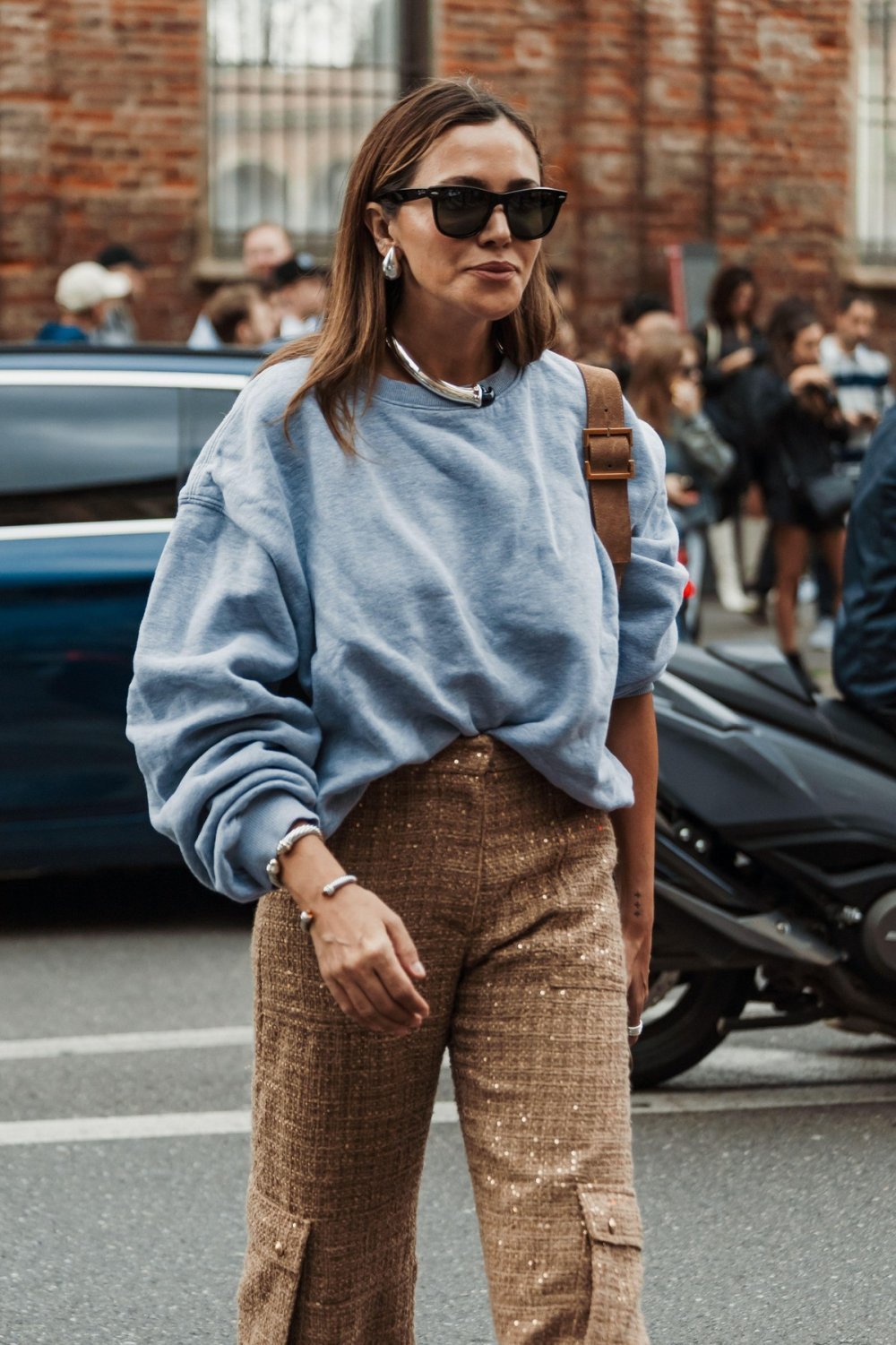 Kombinacija kargo kroja i zemljanog tona daje balans između utilitarnog looka i modne ozbiljnosti. Nose se uz bijele majice, crne kožne jakne ili predimenzionirane sakoe, a tenisice u bež varijantama dodatno naglašavaju sportsku inspiraciju.