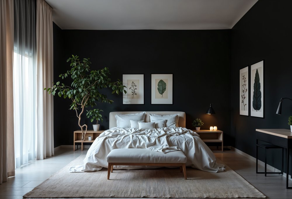 Materijali poput drva, lana i svile dodaju dimenziju i kontrast neutralnim tonovima. Ovaj Wabi-sabi pristup unosi prirodnu estetiku i zanimljivost, održavajući prostor vizualno privlačnim. Čiste linije i mekani materijali spajaju suvremeni dizajn i udobnost. Srednjovjekovna ležaljka podsjeća na opuštanje, a luksuzni tepih i niski okvir kreveta dodatno naglašavaju udobnost. Završni detalj, antikne lampe, unose dozu sofisticiranosti i luksuza, čineći sobu kompletnom.